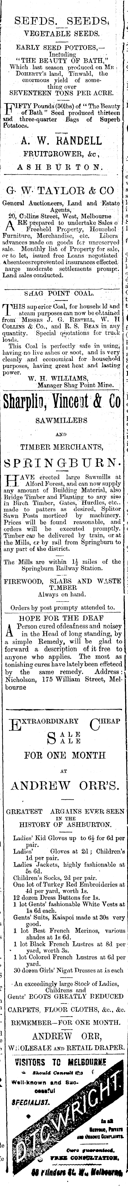 SEFDS.__ SEEDS, VEGETABLE SEEDS. I EARLY SEED POTTOES,— Including "THE BEMJTY OF BATH," Which last season produced on Mk . Dohekty's land, Tmwalcl, the enormous yield of something over SEVENTEEN TONS PER ACRE. TTUFTY Pounds" (501bs) of " The Beauty X lof Bath" Seed produced thirteen and ; three-quarter Bags of Superb Potatoes. A. W. KANDELL i FRUITGROWER, &c,; [ ASHBTJ RT 0 N,; , G- W- TAYLOB&CQ General Auctioneers, Land and Estate : , , Agents, .20, .Collins Street, West, Melbourne ARE prepared to undertake Sales o . Freehold- Property, Hoiioehol Furniture, Merchandise, etc. Libeni advances made on goods for unreserved sale. Monthly list of Property for sale, or to let, issued free Loans negotiated : Absentees represented insurances effectedharge moderate settlements prompr. Land sales conducted. StfAG POINT ~COAL. ~~7 ~~" rjiHIS superior Coal, for household and JL steam purposes can now be obtained from Messrs J. G. Restell, W. It Collins &;Co M and R. S. Bean m.any quantity. Special Rotation's for truck loads. '■•■■. ' *■'-.■•■ This Coal is perfectly safe m using* having no live ashes or soot, and is very! cleanly and economical for household purposes, having great heat and lasting power. . j W. H, WILLIAMS, Manager Shag Point Mine, s Sharplio^ Ymceat & Co SAWMILLERS TIMBER MERCHANTS, BPEINGBUEN. HAVE erected large Sawmills at Alford Forest, and can now supply any amount of Building Material, also , Bridge Timber and Planting to any siao m Bircli Timber, Gates,' Hurdles, etc.. made to patters as desired, Splitor Sawn Posts morticed by machinery. Prices will be found reasonable, and orders will be executed promptly. Timber cap be delivered by train, or at the Mills, cr by rail from Springburn to any part of the district. The Mills are within 1J miles of the Springburn Railway Station. FIREWOOD, SLABS AND WASTE TIMBER Always on hand. Orders by post prompty attended to. HOPE FOR^HE DEAF A Person cured ofdeafness and noisey m the Head of long standing, by a simple Remedy, will be glad to forward a description of it free to anyone who applies. The most as tonishinir cures have lately been effetecd by the same remedy. Address: Nicholson, 175 William Street, Melbourne TTIXTRAORDINARY /^IHEAP SALE ALE FOE ONE MONTH | AT ANDREW ORR'S. GREATEST ARGAJNS EV#R SEEN IN THE HISTORY OF ASHBURTON. Ladies' Kid Gloves up to 6| for 6d per pair. Ladies' Gloves at 2d ; Children's Id per pair. Ladies Jackets, highly fashionable at 5s 6d. Children's Socks, 2d per pair. One lot of Turkey Red Embroideries at 4d per yard, worth Is. 12 dozen Dress Buttons for Is. 1 lot Gents' fashionable White Vests at Is 6d each. Gents' Suits, Kaiapoi made at 30s very good. 1 lot Best French Merinos, various shades at Is 6d. 1 lot Black French Lustres at 8d per yard, worth 3s. 1 lot Colored French Lustres at 6d per yard. 30 dozen Girls' Nignt Presses at is each ■ An exceedingly large Stock of Ladies, Childrens and Gents' BOOTS GREATLY REDUCED CARPETS, FLOOR CLOTHS, &c, &c. REMEMBER—FOR ONE MONTH. ANDEEW ORE, WHOLESALE akj> RETAIL DRAPER. , . t . VISITORS TO MRBQURMf^g *■ Should G»nmlt t&9 f Well-known and BuoBFECIAUS7, WjZMj&F& nUOB CONKSfcTATIOM,
