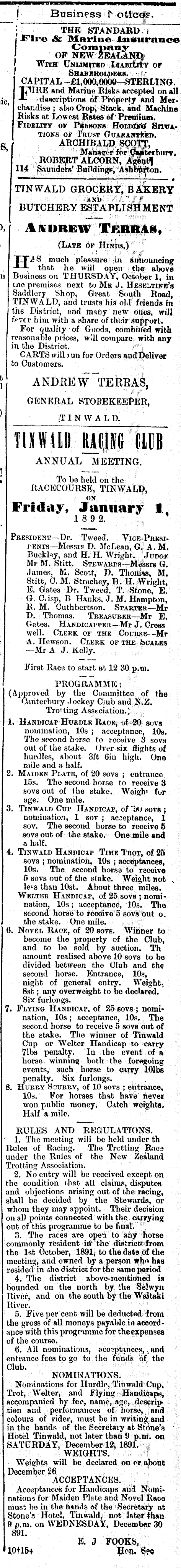 I Business r oticaiF. THE STANDARD j JETIi-o &. Marine insurance Company OP NEW ZEALAND With Unlimited LiAßiiitv or SHAREHOLDERS. CAPITAL ~£1,000,00Q0--STERLING. TEIIRE and Marine Risks accepted on all ■'-*• descriptions of Property and Merchandise ; also Crop, Stack, and Machine Risks at Lowest Rates of Premium. FIDELITY OF PIthHONS HoLJlfifef SITUATIONS OF PrUST GuAftASTKEft. ARCHIBALD, SCOTT, Manager for Qmplterbnnr, ROBERT ALCORN, Agen^ 114 Saunders' Buildings, Ash burton. TTNWALD GROCERY, BAKERY ■' and ' '. ';' * BUTCHERY ESTABLISHMENT IIDREW TERRAS, (Late of Hinds,) TTi S much pleasure m announcing -"- that he wiil open the- above Business on THURSDAY, October 1, m tne premises next to Mb J. Hjeseltikk's Saddlery Shop, Great South Road, TINWALD, and trusts his oU friends m I the District, and m;tny now ones, will f?7tr him with a nhare of their support. For quality of Goods, combined with reasonable prices, will compare with any m the District. CARTS will run for Orders and Deliver to Customers. ANDJR.EW~TERBAS, GENERAL STOREKEEPER, iT INWALD. Tirnifipnilf ANNUAL MEETING. To be held on the RACECOURSE, TINWALD, ON Friday, January 1. 18 9 2. ' President—Dr. Tweed. Vice-Presi-rENTS—Messrs D. McLean, G. A.M. Buckley, and H. H. Wright. Judgjh Mr M. Stitt. Stewards—Messrs G. James, M. Scott, D. Thomas, M. Stitt, C. M. Strachey, H. H. Wright, E. Gates Dr. Tweed, T. Stone, E. G. O.isp, B Hanks, J. M. Hampton, It. M. Cuthbertson. Startkk—Mr D. Thomas. Treasurer—Mr E. Gates. Handicapver—MrJ. Cress well. Clerk of the CoußvSE—Mr A. Hewson. Clerk of the Jscales —Mr A J. Kelly. First Race to start at 12 30 p.m. PROGRAMME: (Approved by the Committee of the Canterbury Jockey Club and N.Z. Troi ting Association.^ ■li Handicap Hurdle Rack, of 20 scjvs nomination, 10s ; acceptance, 10s. The second horse to receive 3 soy« out of the stake. Over six flights of hurdles, about 3ft 6in high. One mile and a half. 2. Maiden Pi-ate, of 20 soys ; entrance. 15s. The second horse to receive 3 soys out of the stake. Weigh" for age. One mile. 3. Tinwald Cup Handicap, of ~bm soys ; nomination, 1 soy ; acceptance, 1 sow The second horse to receive 6 soys out of the stake. Onejnile and a half. 4. Tinwald Handicap Time Thot, of 25 60V3 ; nomination, 10s ; acceptances, 10s. The second horsa to receive 5 soys out of the slake. Weight not , lcs than lOst. About three miles. Welter Handicap, of 25 soys ; nomination, 10s; acceptance, 10s. The second horse to receive 5 soys out o. the stake. One mile. 6. Novel Race, of 20 soys. Winner to become the property of the Club, and to be sold by auction. Th amount realised above 10 soys to be divided between the Club and the second horse. Entrance, 10s, : night of general entry. Weight-, Bst; any overweight to be declared. Six furlongs. 7. Flying Handicap, of 25 soys ; nomination, 10s; acceptance, 10s. The secbrd horse to receive 5 soys out of the stake. The winner of Tinwald Cup or Welter Handicap to carry 71bs penalty. In the event of a horse winning both the foregoing events, such horse to carry lOlbs penalty. Six furlongs. 8. Hurry Scsurry, of 10 soys ; entrance, 10s. For horses thit have never won public money. Catch weights. Half a mile. RULES AND REGULATIONS. 1. The meeting will be held under th Rules of Racing. The Trctting Race under the Rules of the New Zealand Trotting Association. 2. No entry will be received except on the condition i.hat all claims, disputes and objections arising out of the racing, shall be decided by the Stewards, or whom they may appoint. Their decision ' on all points connected with the. carrying out of this programme to be final. 3. The races are ope^ to any horse commonly resident irivthe district* from the Ist October, 1891, to the date of the meeting, and owned by a person who has resided m cho district for the same period 4. The district above-mentioned is bounded on the north by. the Selwyn River, and on the south by the Waitaki River. 5. Five per cent will be deducted from the gross of all moneys payable m acoordancc with this progr-inuue for the expenses of the course. 6. All nominations, acceptances, and entrance fees to go to the funds of. the Club. NOMINATIONS. Nominations for Ilurdlo, Tinwald Cup, Trot, Welter, and Flying Handicaps, accompanied by fee. name, age, description and performances of horse, and colours of rider, must be m writing and m the hands of the Secretary at Stone's Hotel Tinwald, not later than 9 p.m. on SATURDAY, December 12, 1891. WEIGHTS. Weights will be declared on or about December 26 ACCEPTANCES. Acceptances for Handicaps and Nominations for Maiden Plate and Novel Race must be m the hands of the Secretary at Stone's Hotel, Tinwald, not later than 9 p.m. on WEDNESDAY, December 30 891. E. J FOOKS, 10+15* Hon. S?o