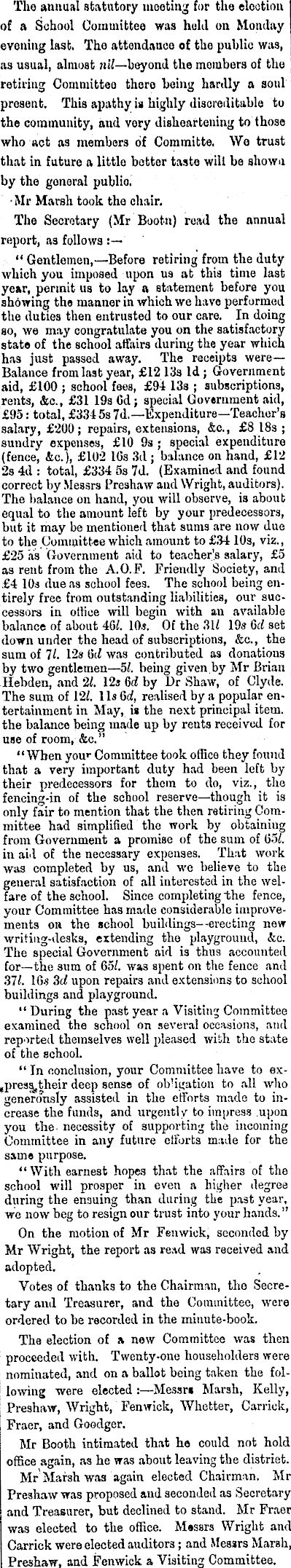 The annual statutory mooting for the elootion of a School Committee was hold on Monday evening last. The attendauee of the public was, as usual, almost nil— beyond the members of the retiring Committeo there being hardly a soul present. This apathy is highly discreditable to the community, and very disheartening to those who act as members of Committe. We trust that in future a little better taste will be shown by the general public • Mr Marsh took the chair. The Secretary (Mr Bootn) road the annual report, as follows : " Gentlemen, —Before retiring from the duty which you imposed upon us at this time last year, permit us to lay a statement before you showing the manner in which we have performed the duties then entrusted to our care. In doing so, we may congratulate you on the satisfactory state of the school affairs during the year which has just passed away. The receipts were— Balance from last year, £l2 13s Id; Government aid, £IOO ; school fees, £94 138 ; subscriptions, rents, &c, £3l 19s Gd; special Government aid, £95: total, £334557 d.— Expenditure—Teacher's salary, £200; repairs, extensions, &c, £8 18s ; sundry expenses, £lO 9s ; special expenditure (fence, &c), £lO2 16s 3d ; balance on hand, £l2 2s 4d : total, £334 5s 7d. (Examined and found correct by Messrs Preshaw and Wright, auditors). The balance on hand, you will observe, is about equal to the amount left by your predecessors, but it may be mentioned that sums are now due to the Committee which amount to £34 10s, viz., £25 as Government aid to teacher's salary, £5 as rent from the A.O.P. Friendly Society, and £4 10s due as school fees. The school being entirely free from outstanding liabilities, our successors in office will begin with an available balance of about 46/. 10*. Of the 31/ 19s Gd set down under the head of subscriptions, &c, the sum of 11. 12s Gd was contributed as donations by two gentlemen—s/. being given by Mr Brian Hebden, and 21. 12* Gd by Dr Shaw, of Clyde. The sum of 12/. lls Gd, realised by a popular entertainment in May, is the next principal item, the balance being made up by rents received for use of room, &c." "When your Committee took office they found that a very important duty had been left by their predecessors for them to do, viz., the fencing-in of the school reserve—though it is only fair to mention that the then retiring Committee had simplified the work by obtaining from Government a promise of the sum of 65/. in aid of the necessary expenses. That work was completed by us, and we believe to the geueral satisfaction of all interested in the welfare of the school. Since completing the fence, your Committee has made considerable improvements on the school buildings—erecting new writing-desks, extending the playground, <fce. The special Government aid is thus accounted for—the sum of 65/. was spent on the fence and 37/. 16$ 3d upon repairs and extensions to school buildings and playground. " During the past year a Visiting Committee examined the school on several occasions, and reported themselves well pleased with the state of the school. " In conclusion, your Committee have to ex,presa,their deep sense of ob'igation to all who generously assisted in the efforts made to increase the funds, and urgently to impress upon you the necessity of supporting the incoming Committee in any future efforts made for the same purpose. "With earnest hopes that the affairs of the school will prosper in even a higher degree during the ensuing than during the past year, we now beg to resign our trust into your hands." On the motion of Mr Fenwick, seconded by Mr Wright, the report as read was received and adopted. Votes of thanks to the Chairman, the Secretary and Treasurer, and the Committee, were ordered to be recorded in the minute-book. The election of a new Committee was then proceeded with. Twenty-one householders were nominated, and on a ballot being taken the following were elected : —Messrt Marsh, Kelly, Preshaw, Wright, Fenwick, Whetter, Carrick, Fraer, and Goodger. Mr Booth intimated that he could not hold office again, as he was about leaving the distriet. Mr Marsh was again elected Chairman. Mr Preshaw was proposed and seconded as Secretary and Treasurer, but declined to stand. Mr Fraer was elected to the office. Messrs Wright and Carrick were elected auditors; and Messrs Marsh, Preshaw, and Fenwick a Visiting Committee.