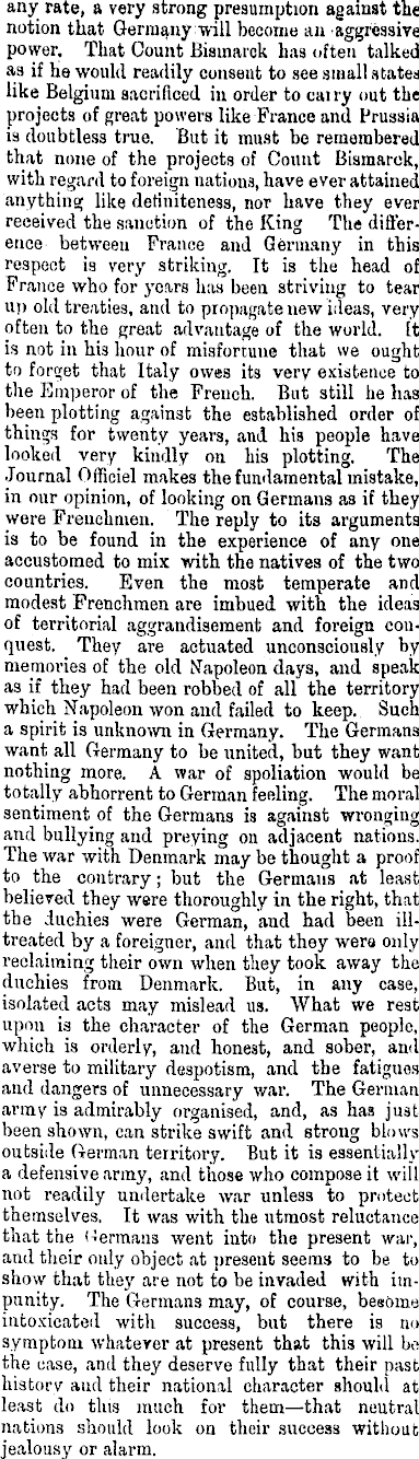 any rate, a very strong presumption against the notion that Germany ■will become an aggressive power. That Count Bismarck has often talked as if he would readily consent to see small states like Belgium sacrificed in order to cairy out the projects of great powers like France and Prussia is doubtless true. But it must be remembered that none of the projects of Count Bismarck, with regard to foreign nations, have ever attained anything; like detiniteness, nor have they ever received the sanction of the King The difference between France and Germany in this respect is very striking. It is the head of Prance who for years has been striving to tear up old treaties, and to propagate new ideas, very often to the great advantage of the world, [t is not in his hour of misfortune that we ought to forget that Italy owes its very existence to the Emperor of the French. But still he lias been plotting against the established order of things for twenty years, and his people have looked very kindly on his plotting. The Journal Officiel makes the fundamental mistake, in our opinion, of looking on Germans as if they were Frenchmen. The reply to its arguments is to be found in the experience of any one accustomed to mix with the natives of the two countries. Even the most temperate and modest Frenchmen are imbued with the ideas of territorial aggrandisement and foreign conquest. They are actuated unconsciously by memories of the old Napoleon days, and speak as if they had been robbed of all the territory which Napoleon won and failed to keep. Such a spirit is unknown in Germany. The Germans want all Germany to be united, but they want nothing more. A war of spoliation would be totally abhorrent to German feeling. The moral sentiment of the Germans is against wronging and bullying and preying on adjacent nations. The war with Denmark may be thought a proof to the contrary; but the Germans at least believed they were thoroughly in the right, that the duchies were German, and had been illtreated by a foreigner, and that they were only reclaiming their own when they took away the duchies from Denmark. But, in any case, isolated acts may mislead us. What we rest upon is the character of the German people, which is orderly, and honest, and sober, and averse to military despotism, and the fatigues and dangers of unnecessary war. The German army is admirably organised, and, as has just been shown, can strike swift and strong blows outside German territory. But it is essentially a defensive army, and those who compose it will not readily undertake war unless to protect themselves. It was with the utmost reluctance that the Hermans went into the present war, and their only object at present seems to be to show that they are not to be invaded with impunity. The Germans may, of course, besome intoxicated with success, but there is no symptom whatever at present that this will be the case, and they deserve fully that their past history and their national character should at least do this much for them—that neutral nations should look on their success without jealousy or alarm.