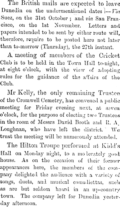 The British mails are expected to leave Dunedin on the undermentioned dates : Via Suez, on the 31st October ; and via San Francisco, on tho Ist November. Letters and papers intended to be sent by either route will, therefore, require to be posted here not later than to-morrow (Thursday), the 27th instant. A meeting of members of the Cricket Club is to be held in the Town Hall to-night, at eight o'clock, with the view of adopting rules for the guidance of tin affairs of tho Club. Mr Kelly, the only remaining Trustee of the Cromwell Cemetry, has convened a public meeting for Friday evening next, at seven o'clock, for the purpose of electing two Trustee* in the room of Messrs David Booth and U. A. Loughnan, who have left the district. We. trust the meeting will be numerously attended. The Hilton Troupe performed at Kidd's Hall on Monday night, to a mo lerately good house. As on the occasion of their former appearances here, the members of the company delighted the audience with a variety of songs, duets, and musical comediettas, such as are but seldom hoard in an up-country town. The company left for Dunedin yesterday afternoon.