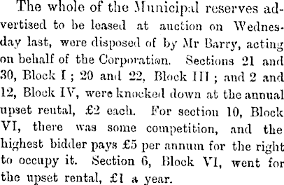 The whole of the .Municipal reserves advertised to be leased at auction on Wednesday last, were disposed of by Mr Barry, acting on behalf of the Corporation. Sections 21 and 30, Block I ; 20 and 22, Block 111 ; and 2 and 12, Block IV, were knocked down at the annual upset reutal, £2 each. For section 10, Block VI, there was some competition, and the highest bidder pays £5 per annum for the right to occupy it. Section 6, Block VI, went for the upset rental, £1 a year.