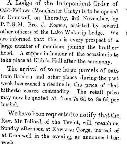 A Lodge of the Independent Order of Odd-Fellows (Manchester Unity) is to be opened " in Cromwell on Thursday, 3rd November, by P.P.G.M. Bro. J. Rogers, assisted by several other officers of the Lake Wakatip Lodge. We / are informed that there is every prospect of a large number of members joining the brotherhood. A supper in honour of the occasion is to take place at Kidd's Hall after the ceremony. The arrival of some large parcels of oats from Oamaru and other placos during the past week has caused a decline in the pnco of that hitherto scarce commodity. The retail price may now be quoted at from 7s 6d to 8a fid per bushel. We have heen requested to notify that the Rev. Mr Telford, of the Toviot, will preach on Sunday afternoon at Kawarau Gorge, instead of at Cromwell in the evening, as anuounoed last ivoek.