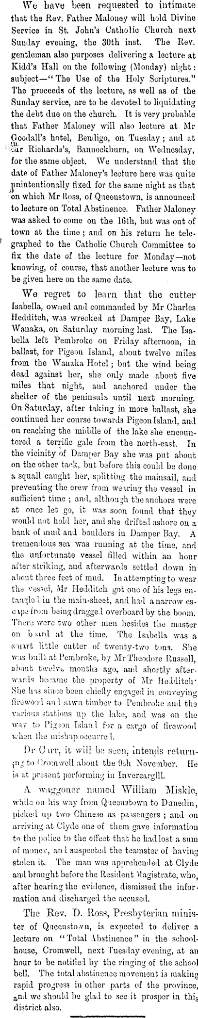 We have been requested to intimate that tha Rev, Father Maloney will hold Divine Service in St. John’s Catholic Church next Sunday evening, the 30th inst. The Rev. gentleman also purposes delivering a lecture at Kidd’s Hall on the following (Monday) night: subject—“ The Use of the Holy Scriptures.” The proceeds of the lecture, as well as of the Sunday service, are to be devoted to liquidating the debt due on the church. It is very probable that Father Maloney will also lecture at Mr Goodall’s hotel, Bendigo, on Tuesday ; and at ’ Nir Richards’s, Bannockburn, on Wednesday, for the same object. We understand that the date of Father Maloney’s lecture here was quite unintentionally fixed for the same night as that on which Mr Boss, of Queenstown, is announced to lecture on Total Abstinence. Father Maloney was asked to come on the 16th, but was out of town at the time ; and on his return he tele--1 graphed to the Catholic Church Committee to fix the date of the lecture for Monday—not knowing, of course, that another lecture was to be given here on the same date. We regret to learn that the cutter Isabella, owned and commanded by Mr Charles Hedditch, was wrecked at Damper Bay, Lake Wauaka, on Saturday morning last. The Isabella left Pembroke on Friday afternoon, in ballast, for Pigeon Island, about twelve miles from the Wauaka Hotel; but the wind being dead against her, she only made about five miles that night, and anchored under the shelter of the peninsula until next morning. On Saturday, after taking in more ballast, she continued her course towards Pigeon Island, and on reaching the middle of the lake she encountered a terrific gale from the north-east. In the vicinity of Damper Bay she was put about on the other tack, but before this could be done a squall caught her, splitting the mainsail, and preventing the crew from wearing the vessel in sufficient time ; and, although the anchors were at once let go, it was soon found that they would not hold her, and she drifted ashore on a bank of mud and boulders in Damper Bay. A tremendous sea was running at the time, and the unfortunate vessel filled within an hour after striking, and afterwards settled down in about three feet of mud. In attempting to wear the vessel, Mr Hedditch got one of his legs entangle I in the main-sheet, and had a narrow escape from being dragged overboard by the boom. There wore two other men besides the master on b >ard at the time. The Isabella was a Kmart little cutter of twenty-two tons. She was built .at Pembroke, by Mr Theodore Russell, about twelve months ago, and shortly afterwards became the property of Mr Hedditch" She has since been chiefly engaged in conveying firewood and sawn timber to Pembroke and the various stations np the lake, and was on the wav to Pig mu Tslanl for a cargo of firewood when the mishap oecurre I. Dr (J ut. it will be; seen, intends returning to (Vomwoll about the 9th November. He is at present performing in Invercargill. A. waggoner named William Misklo, while on iiis way from Queenstown to Dunedin, picked up two Chinese as passengers ; and on arriving at Clyde one of them gave information to the police to the effect that ho had lost a sum of manor, an 1 suspected the teamster of having stolen it. The man was apprehended at Clyde ami brought before the Resident Magistrate, who, after hearing the evidence, dismissed the information and discharged the accused. The Rov. D. Ross, Presbyterian minister of Queenstown, is expected to deliver a lecture on “Total Abstinence” in the schoolhouse, Cromwell, next Tuesday evening, at an hour to be notified by the ringing of the school bell. The total abstinence movement is making rapid progress in other parts of the province, a nd we should he glad to see it prosper in thi 3 district also.