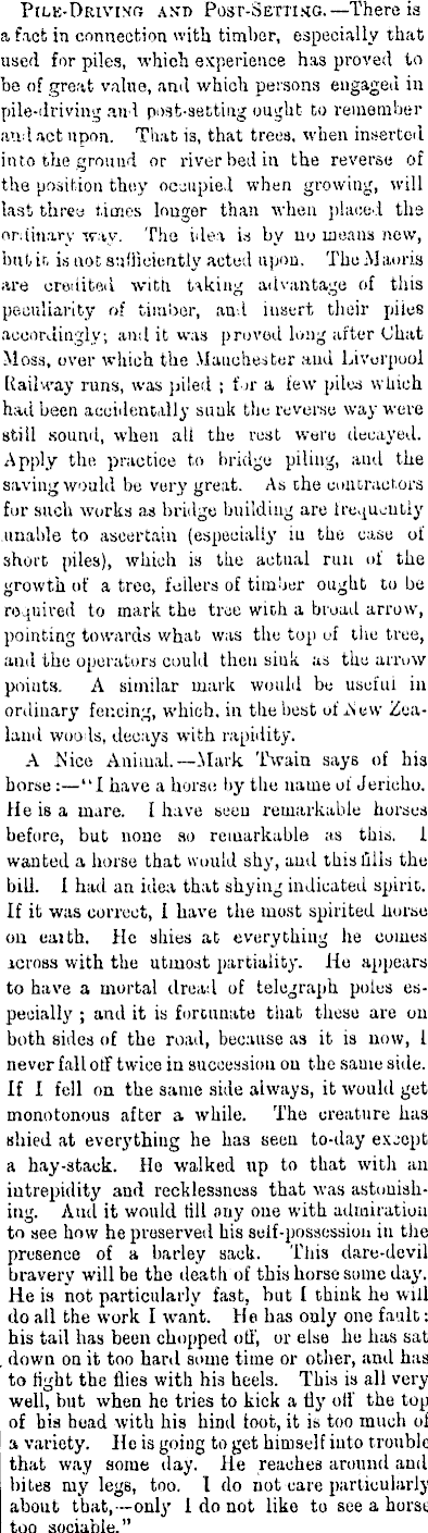 PtLK-DiuvtNT: an'd Post-Settisg. —There is a fact in connection witla timber, especially that used for piles, which experience has proved to he of great value, and which persons engaged in pile-driving and post-setting ought to remember and act upon. That is, that trees, when inserted into the ground or river bed in the reverse of the position they occupied when growing, will last three times longer than when placed the ordinary way. The idea is by no means new, but, it, is not sufficiently acted upon. The .Maoris are credited with taking advantage of this peculiarity of timber, and insert their piles accordingly; and it was proved long after Chat Moss, over which the Manchester and Liverpool Railway runs, was piled ; for a few piles which had been accidentally suuk the reverse way were still sound, when all the rest were decayed. Apply the practice to bridge piling, and the saving would be very great. As the contractors for such works as bridge building arc frequently unable to ascertain (especially in the case of short piles), which is the actual run of the growth of a tree, fellers of timber ought to be required to mark the tree with a broad arrow, pointing towards what was the top of the tree, and the operators could then sink as the arrow points. A similar mark would be useful in ordinary fencing, which, in the best of .New Zealand woods, decays with rapidity. A A’ice Animal.—Mark Twain says of his horse : —“I have a horse by the name of Jericho. He is a mare. I have seen remarkable horses before, but none so remarkable as this, i wanted a horse that would shy, and this fills the bill. I had an idea that shying indicated spirit. If it was correct, I have the most spirited horse on uaith. He shies at everything he comes across with the utmost partiality. Ho appears to have a mortal dread of telegraph poles especially ; and it is fortunate that these are on both sides of the road, because as it is now, 1 never fall off twice in succession on the same side. If I fell on the same side always, it would get monotonous after a while. The creature has shied at everything he has seen to-day except a hay-stack. He walked up to that with an intrepidity and recklessness that was astonishing. And it would till any one with admiration to see how he preserved his self-possession in the presence of a barley sack. Tills dare-devil bravery will be the death of this horse some day. He is not particularly fast, but I think ho will do all the work I want. He has only one fault: his tail has been chopped off, or else he has sat , down on it too hard some time or other, and has to tight the flies with his heels. This is all very well, but when ho tries to kick a fly off the top of his head with his hind loot, it is too much of a variety. Ho is going to get himself into trouble that way some day. He reaches around and bites my legs, too. I do not care particularly about that,—only 1 do not like to see a horse too sociable.”