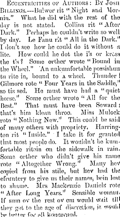 Eccuxtrlcities of Authors: By Josh Bii.linOs.— Buiwor rit “ Night and Mornin.” What lie did with the rest of the day is not stated. Collins rit “ After Dark.” Perhaps he couldn’t write so well by day. Le Fanu rit “ All in the Dark.” I don’t see how he could do it without a lite. How could he dot the i’s or kress the t’s 1 Some orthor wrote “ Bound in the Wheel.” An unkumfortablo possislum tu rite in, hound to a wheel. Thunder ! Gilmore rote “ Four Years in the Saddle,” so tis sed. He must have had a “quiet horse.” Some orther wrote “ All for the Best.” That must have been Seward ; that’s him klean throo. Miss Mulock rote “ Nothing New.” This could be said of many others with propiiety. Harrington rit “ Inside.” 1 take it for granted that most people do. It wouldn’t bn kumfortablo ritein on the sidewalk in rain, Some orther who didn’t give his name rote “Altogether Wrong.” Many heV copied from his stile, but hev had the ofruntory to give us their names, hein lost to shame. Mrs Mackenzie Daniels rote “After Long Years.” Sensible woman, If sum ov the rest ov cm would wait tIH they get to the age of discretion, it wquld be better for eff konccmcd,