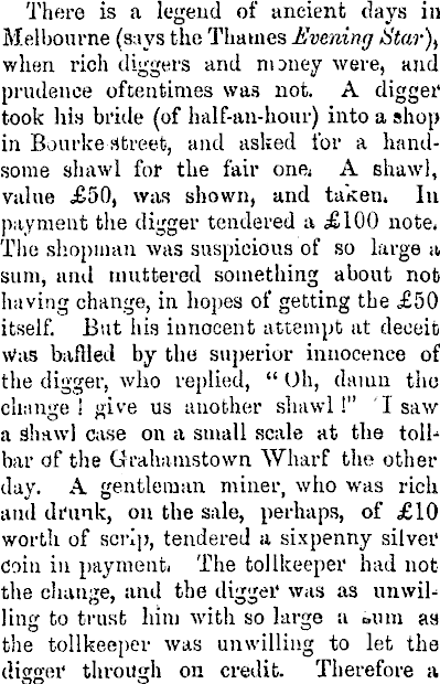 There is a legend of ancient days in Melbourne (says the Thames Evening Star ), when rich diggers and money were, and prudence oftentimes was not. A digger took his bride (of half-an-hour) into a shop in Bourke street, and asked for a handsome shawl for the fair one* A shawl, value £SO, was shown, and taKein In payment the digger tendered a £IOO note. The shopman was suspicious of so large a sum, and muttered something about not having change, in hopes of getting the £SO itself. But his innocent attempt at deceit was baflled by the superior innocence of the digger, who replied, “ Oh, damn the change! give us another shawl!” I saw a shawl case on a small scale at the tollbar of the Cfrahamstown Wharf the other day. A gentleman miner, who was rich and drunk, on the sale, perhaps, of £lO worth of scrip, tendered a sixpenny silver Coin in payment. The tollkeeper had not the change, and the digger was as unwilling to trust him with so large a dim as the tollkeeper was unwilling to let the digger through on credit. Therefore a