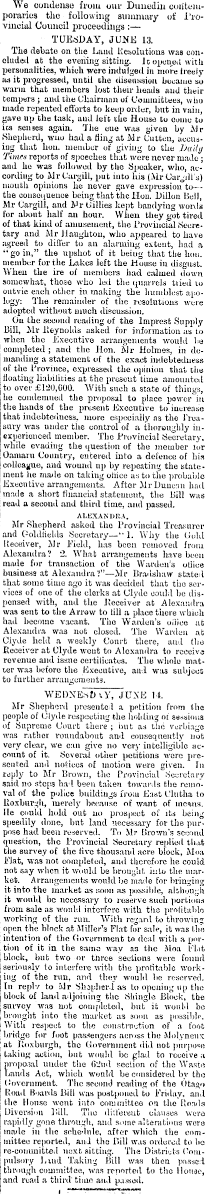 We condense from our Dunedin contemporaries tlie following summary of I’rovmeial Council proceedings : TUESDAY, JUNE 13. The debate on the Land desolations was concluded at the evening sitting, it opened with personalities, which were indulged in more freely as it progressed, until the discussion became so warm that members lost their heads and their I tempers ; and the Chairman of Committees, who j made repeated efforts to keep order, but in vain, jgave up the task, and left the House to come to its senses again. The cue was given by Mr Shepherd, who had a liing at Mr Uutteu, accusing that lion, member of giving to the Daily Times reports of speeches that were never made ; and he was followed by the Speaker, who, according to Mr Cargill, put into his (Mr Cargill's) mouth opinions he never gave expression to—the consequence being that the lion. Dillon Bell, Mr Cargill, and Mr Lillies kept bandying words for about half an hour. When they got tired of that kind of amusement, the Provincial Secretary and Mr Haughton, who appeared to have agreed to differ to an alarming extent, had a “go in,” the upshot of it being that the lion, member for the Lakes left the House in disgust. When the ire of members had calmed down somewhat, those who led the quarrels tiled to outvie each other in making the humblest apology: The remainder of the resolutions were adopted without much discussion, i On the second reading of the Imprest Supply I Bill, Mr lleynolds asked for information as to when the Executive arrangements would be completed ; and the Hon. Mr Holmes, in demanding a statement of the exact indebtedness of the Province, expressed the opinion that the floating liabilities at the present time amounted to over £120,000. With such a state of things, he condemned the proposal to place power in the hands of the present Executive to increase that indebtedness, more especially as the Treasury was under the control of a thoroughly inexperienced member. The Provincial Secretary, while evading the question of the member lor I Oamaru Country, entered into a defence of his colleague, and wound up by repeating the state- | meut he made on taking office as to the probable | Executive arrangements. After Mr Duncan had | made a short financial statement, the Bill was j read a second and third time, and passed. ALEXANDRA, Mr Shepherd asked the Provincial Treasurer and Goldfields Secretary— “1. Why the Gold i deceiver, Mr Field, has boon removed from Alexandra? 2. What arrangements have been j made for transaction of the Warden's ofiice business at Alexandra?”—Mr Bradshaw stated j that some time ago it was decided that the serj vices of one of the clerks at Clyde could bo dispensed with, and the Deceiver at Alexandra was sent to the Arrow to fill a place there which had become vacant. The Warden’s office at I Alexandra was not closed. The Warden at Clyde held a weekly Court there, and the Receiver at Clyde went to Alexandra to receive revenue and issue certificates. The whole matter was before the Executive, and was subject to further arrangements. WE D X JU X E 11. Mr Shepherd presented a petition from the people of Clyde respecting the holding of sessions of Supreme Court there ; hut as the verbiage i was rather roundabout and consequently not | very clear, we can give no very intelligible ac- ■ count of it. Several other petitions were pre- | sorted ami notices of motion were given. In | reply to Mr Brown, the Provincial Secretary ; said no steps had been taken towards the remoj val of the police buildings from East Glutha to | Roxburgh, merely because of want of means. I lie could hold out no prospect of its being j speedily done, but land necessary for the purI pose had been reserved. To Mr Brown’s second ; question, the Provincial Secretary replied that j the survey of the five thousand acre block, Moa I Flat, was not completed, and therefore he could i not say when it would be brought into the mar- ! kot. Arrangements would be made for bringing i it into the market as soon as possible, although it would be necessary to reserve such portions j from sale as would interfere with the profitable i working of the run. With regard to throwing ! open the block at Miller’s Flat for sale, it was the 1 intention of the Government to deal with a por- , tion of it in the same way as the Moa Flat | block, but two or three sections were found I seriously to interfere with the profitable work- ! ing of the run, and they would be reserved. ! In reply to Mr Shepherd as to opening up the | block of land adjoining the Shingle Block, the survey was not completed, but it would be j brought into the market as soon as possible. I With respect to the construction of a foot bridge for foot passengers across the Molyneux at Roxburgh, the Government did not purpose i taking action, but would bo glad to receive a I proposal under the 62nd section of the Waste | Lauds Act, which would be considered by the Government. The second reading of the Otago I Road Boards Bill was postponed to Friday, and ! the House went into committee on the Roads , Diversion Bill. The different clauses were i rapidly gone through, and some alterations were j made in the schedule, after which the cam- : mitteo reported, and the Bill w.is ordered to bo | re-committed next sitting. The Districts GomI pulsory Bind Taking Bill was then passed ] through committee, was reported to the House, land read a third time and passed. i