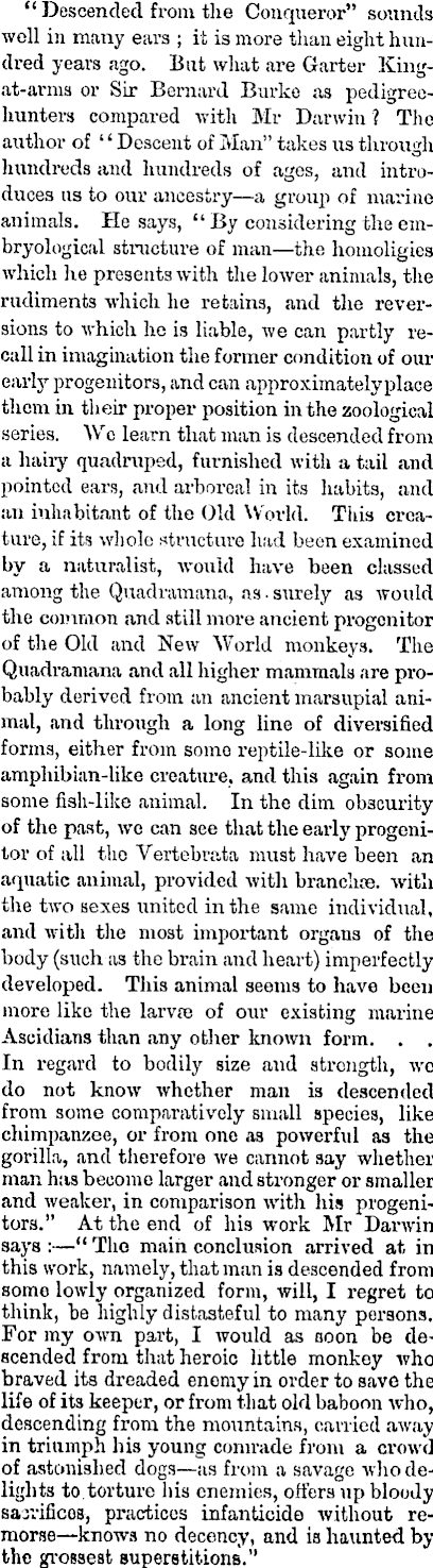 459Darwin's "Descent of Man." Cromwell Argus, Volume 2, Issue 88, 18 July 1871, Page 6