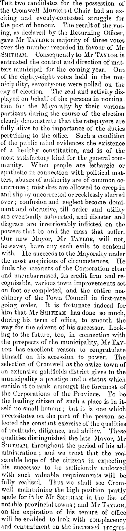 The two candidates for the possession of the Cromwell Municipal Chair had an exciting and evenly-contested struggle for the post of honour. The result of the voting, as declared by the Returning Officer, gave Mr Taylor si majority of three votes over the number recorded in favour of Mr Smith am. Consequently to Mr Taylor is entrusted the control and direction of matters municipal for the coming year. Out of the eighty-eight votes held in the municipality, seventy-one were polled on the day of election. The zeal and activity displayed on behalf of the persons in nomination for the Mayoralty by their various partisans during the course of the election clearly demonstrate that the ratepayers are fully alive to the importance of the duties pertaining to the office. Such a condition of the public mind evidences the existence of a healthy constitution, and is of the most satisfactory kind for the general community. When people are lethargic or apathetic in connection with political matters, abuses of authority are of common occurrence ; mistakes are allowed to creep in and slip by uncorrected or recklessly slurred over; confusion and neglect become dominant and obtrusive, till order and utility are eventually subverted, and disaster and disgrace are irretrievably inflicted on the powers that be and the mass that suffer. Our new Mayor, Mr Taylor, will not, hovvever, have any such evils to contend with, lie succeeds to the Mayoralty under the most auspicious of circumstances. He tinds the accounts of the Corporation clear and unembarrassed, its credit firm and recognisable, various town impi'ovements set on foot or completed, and the entire machinery of the Town Council in first-rate going order. It is fortunate indeed for him that Mr Smitham has done so much, during his term of office, to smooth the way for the advent of his successor. Looking to the future, too, in connection with the prospects of the municipality, Mr TayLOK has excellent reason to congratulate himself on his accession to power. The selection of Cromwell as the assize town of an extensive goldtiekls district gives to the municipality a prestige and a status which entitle it to rank amongst the foremost of the Corporations of the Province. To be the leading citizen of such a place is in itself no small honour; but it is one which necessitates on the part of the person selected the constant exercise of the qualities of rectitude, diligence, and ability. These qualities distinguished the late Mayor, Mr I S.mitham, throughout the period of his administration ; and we trust that the rea- : sonable hope of the citizens in expecting i his successor to be sufficiently endowed with such valuable requirements will be fully realised. Thus we shall see Cromj well maintaining the high position partly , njade for it by Mr S.mitiiaji in the list of j notable provincial towns ; and Mr Taylor, I on the expiration of his tenure of office will be enabled to look with complacency md on the increased progrcn-