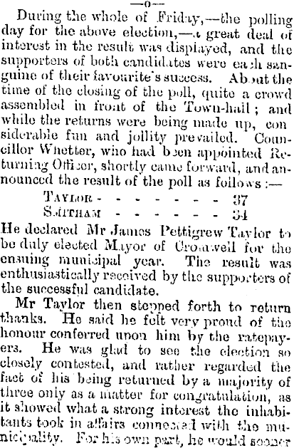 —0 During the whole of Friday,—the polling day for the above election,—a great deal of interest in the result, was displayed, and the supporters of both candidates were eajh sanguine of their favourite's success. Ab >ut the time of the closing of the poll, cpiite a crowd assembled in front of the Tuwn-hail ; and while the returns were being made up, eon j siderable fun and jollity prevailed. Councillor YV'netter, who had been appointed Returning Offioor, shortly came forward, and announced the result of the poll as follows : ' Tavi.dk . <s7 S.-iITIIAM - O-i He declared Mr James Pettigrew Taylor 11 be duly elected Mayor of Croav.veil fov the ensuing municipal year. The result was enthusiastically received by the supporters of I the successful candidate. j Mr Taylor then stepped forth to return' thanks. Ho said he felt very proud of the; honour conferred upon him by the ratepayera. He was glad to see the election so closely contested, and rather regarded the face of his being returned by a majority of three only as a matter for congratulation, as : it showed what a strong interest the inhabi- ; tants took in affairs with tlio mu-! mentality. Fo»- his owj: part, he would soonor'