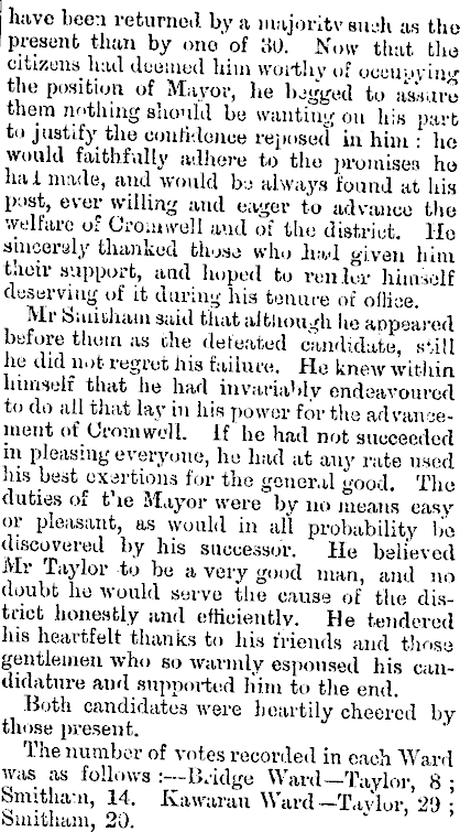 I have been returned bv a majority such as tho | present than by one of 80. Now that the j citizens had deemed him worthy of ooeuyvinii ; the position of Mayor, he bogged to assure them nothing should be wanting on his part to justify the confidence reposed in him ■ lie would faithfully adhere to the promises ho ha J, made, and would be always found at his post, ever willing and eager to advance the welfare o; Cromwell and of the district. He sincerely thanked those who had given him their support, and hoped to renter himself deserving of it during his tenure of office. Mr Suiishaui said that although lie appeared before tliein as the defeated candidate, still he did not regret his failure. He knew within himself that he had invariably endeavoured to do all that lay in his power for the advancement of Cromwell. If he had not succeeded m pleasing everyone, he had at any rate used his best oxartions for the general good. The duties of the Mayor were by no means easy or pleasant, as would in all probability bo discovered by his successor. He believed Mr Taylor to be a very good man, and no doubt he would serve the cause of the district honestly and efficiently. He tendered his heartfelt thanks to his friends and those gentlemen who so warmly espoused his can" didature and supported him to the end. Both candidates were heartily cheered by those present. The number of votes recorded in each Ward was as follows :—-Bridge Ward—Taylor, S • Smitham, 14, Kawarau Ward—Taylor, 29 •' Smitham, 20.