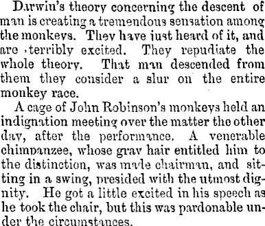 Darwin's theory concerning the descent of man is creating a tremendous sensation among the monkeys. Tliev have lust heard of it, and are .terribly excited. They repudiate the whole theory. Tint man descended from them they consider a slur on the entire monkey race. A cage of John Robinson's monkeys held an indignation meeting over the matter the other day, after the performance. A venerable chimpanzee, whose grav hair entitled him to the distinction, was made chairman, and sitting in a swing, pi-esided with the utmost dignity. He got a little excited in his speech as he took the chair, but this was pardonable under the circumstances.