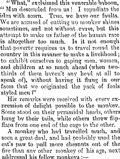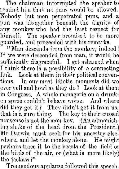 The chairman interrupted the speaker to remind him that no puns would bo allowed. Nobody but men perpetrated puns, and a pun was altogether beneath the dignity of any monkey who had the least respect for himself. The speaker promised to be more guarded, and proceeded with his remarks. "Man descends from the monkey, indeed! If we were descended from man, it would be sufficiently disgraceful. I get ashamed when I think there is a possibility of a connecting link. Look at them in their political conventions. Tn our most idiotic momenta did we ever yell and howl as they do ] Look at them in Congress. A whole managerie on a drunken spree couldn't behave worse. And where did they get it ? They didn't get it from us, that is a sure thing. The key to their cussed nonsense is not the mon-key. (An admonishing shake of the head from the President.) Mr Darwin must seek for his ancestry elsewhere, and let the monkey alone. He might perhans trace it to the beasts of the field or the birds of the air, or (what is more likely) the jackass ?" Tremendous applause followed this speech.