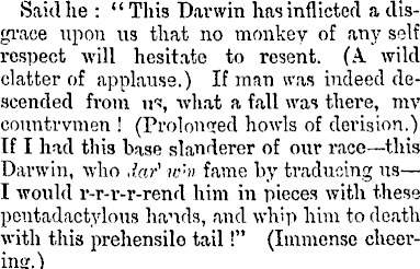 Said lie : " This Darwin has inflicted a disgrace upon us that no monkev of any self respect will hesitate to resent. (A. wild clatter of applause.) If man was indeed descended from us, what a fall was there, mv countrvmen ! (Prolonged howls of derision.) If I had this base slanderer of our race—this Darwin, who ,iar' w'» fame by traducing us— I would r-r-r-r-rend him in pieces with these pentadactylous hands, and whip him to death with this prehensile tail!" (Immense cheering. )