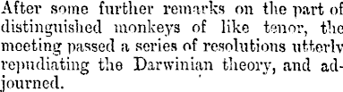 After some further remarks on the part of distinguished monkeys of like tenor, the meeting passed a series of resolutions utterly repudiating the Darwinian theory, and adjourned.