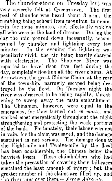 The thunder-storm on Tuesday Inst was very severely felt at Queenstown. The first peal of thunder was heard about 3 a.m., the rumbling being echoed from mountain to mountain for some minutes, and eifectuallv -waking all who were in the land of dreams. During the day the rain poured down incessantly, accompanied by thunder and lightning every few minutes. In the evening the lightning was peculiarly vivid, the air being bcavilv charged with electricity. The Shotover Ttiver was reported to have 1 risen five feet during the day, complete.lv flooding all the river claims. At Arrowtown, the great Chinese Claim, at the rear of the township, narrowly escaped being destroyed by the flood. On Tuesday night the river was observer! to be risincr rapidly, threatening to sweep away the main embankment. The Chinamen, however, were equal to the emergency, for tbev turned out en mtusc, and worked most energetically throughout the night strengthening and protecting the weak portions of the bank. Fortunately, their labour was not in vain, for the claim was saved, and the damage sustained is not serious. The damage done at the Eight-mile and Twelve-mile by the flood has been considerable, the Chinese being the i heaviest losers. Those claimholdcrs who had 1 taken the precaution of covering their tail-races sustained the least amount of injury ; but the , greater number of the claims arc filled up. and ' the river runs over them.— ,4rrott' A4vocak.