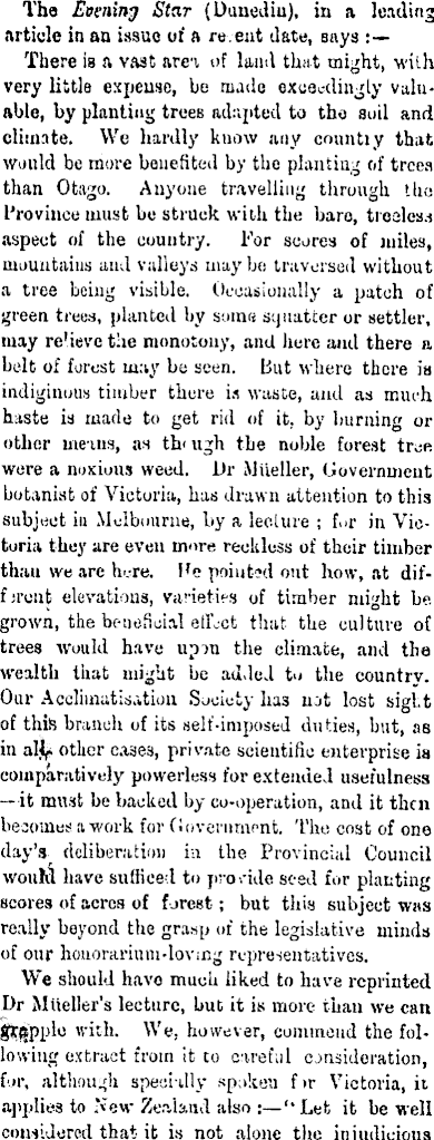 Tha Evening Star (Duuediu), in a leading article in an issue of a re.ent date, says There is a vast area of land that might, with very little expense, be made exceedingly valuable, by planting trees adapted to the soil and climate. We hardly know any country that would be more benefited by the planting of trees than Otago. Anyone travelling through the Province must be struck with the bare, treeless •aspect of the country. For scores of miles, mountains and valleys maybe traversed without a tree being visible. Occasionally a patch of green trees, planted by some stj natter or settler, may re'ievetlie monotony, and here and there a belt of forest may be seen. But where there is indiginous timber there is waste, and as much haste is made to get rid of it, by burning or other means, as tb> ugh the noble forest tree were a noxious weed. Or Mueller, Government botanist of Victoria, has drawn attention to this subject in Melbourne, by a lecture ; for in Victoria they are even more reckless of their timber than we are here. Oe pointed out how, at diffirent elevations, varieties of timber might be grown, the beneficial effect that the culture of trees would have upon the climate, and the wealth that might be added to the country. Our Acclimatisation Society has not lost sight of this branch of its self-imposed duties, but, as in all,- other cases, private scientific enterprise is comparatively powerless for extended usefulness it must be backed by co-operation, and it then becomes a work for Government. The cost of one day’s deliberation in the Provincial Council would have sufficed to provide seed for planting scores of acres of forest; but this subject was really beyond the grasp of the legislative minds of our honorarium-loving representatives. We should have much liked to have reprinted Dr Mueller’s lecture, but it is more than we can grapple with. We, however, commend the following extract from it to careful consideration, for, although specially spoken f>r Victoria, it applies to New Zealand also :—‘‘Let it be well considered that it is not alone the injudicious