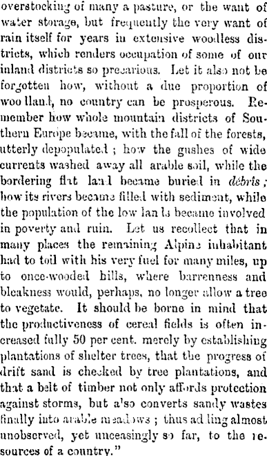 overstocking of many a pasture, or the want of water storage, but frequently the very want of rain itself for years in extensive woodless districts, which renders occupation of some of our inland districts so precarious. Let it also not be forgotten how, without a due proportion of woo Hau l, no country can be prosperous. Remember how whole mountain districts of Southern Europe became, with the fall of the forests, utterly depopulated ; how the gushes of wide currents washed away all arable soil, while the bordering fiat land became buried in debris; how its rivers became filled with sediment, while the population of the low lanli became involved in poverty and ruin. Let us recollect that in many places the remaining Alpine inhabitant had to toil with his very fuel for many miles, up to once-wooded hills, where barrenness and bleakness would, perhaps, no longer allow a tree to vegetate. It should he borne in mind that the productiveness of cereal fields is often increased fully 50 per cent, merely by establishing plantations of shelter trees, that the progress of drift sand is checked by tree plantations, and that a belt of timber not only affords protection against storms, but a'so converts sandy wastes finally iuto arable meadows ; thus ad ling almost unobserved, yet unceasingly so far, to tho iesources of a country. ”