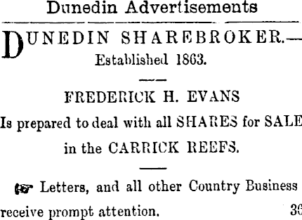 Dnnedin Advertisements "TJUNEDIN SHAREBROKER.— *J Established 18G3. FREDERICK H. EVANS Is prepared to deal with all SHARES for SALE in the CARRICK REEFS. {B - Letters, and all other Country Business receive prompt attention. 38