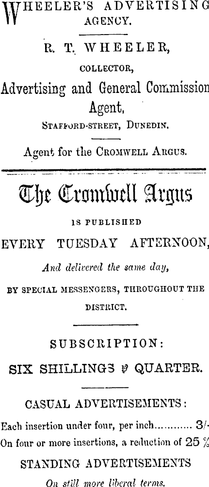 WHEELER'S ADVERTISING AGENCY. R. T, WHEELER, COLLECTOR, Advertising and General Commission Agent, Stafford-street, Dunedin. Agent for the Cromwell Argus. €\)t Cromtoll Srps IS PUBLISHED EVERY TUESDAY AFTERNOON, And delivered the scum day, BY SPECIAL MESSENGERS, THROUGHOUT THE SUBSCRIPTION: SIX SHILLINGS $ QUARTER. CASUAL ADVERTISEMENTS: Each insertion under four, per inch b On four or more insertions, a reduction of 25 STANDING ADVERTISEMENTS On still more liberal terms.