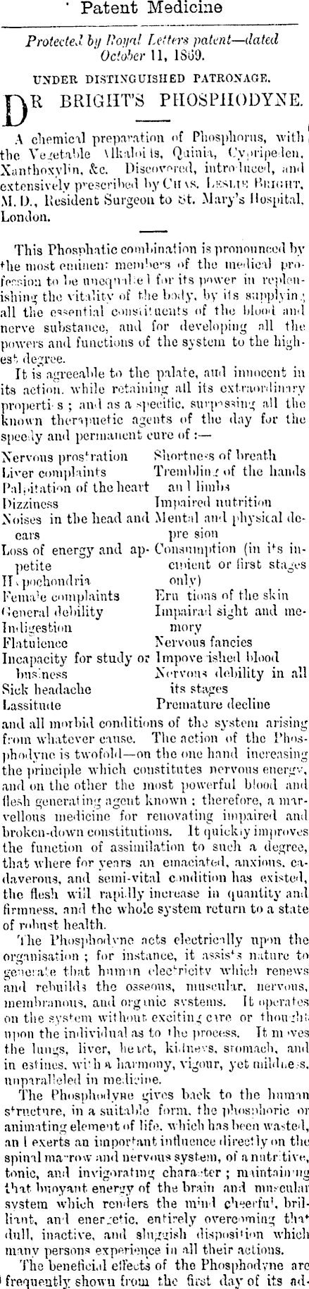 Patent Medicine Protected by Royal Letter* patent — dated 'October 11, 1869. UNDER DISTINGUISHED TATRONAGE. \R BRIGHT'S PHOSPHODYNE. A chemical preparation of Phosphorus, villi the Vegetable Xanthoxyl'n, &i extensively p r es M.D., Resident London. tlkaloils, Qainia, Cyoripeden, Discolored, introduced, mid rihedbyCuvs. Lesmh Rjuuht, Surgeon to St. Mary's Hospital. This Phosphatic combination is pronounced by the most eminent membe-s of the medical profession to l>e nneqnalie 1 for its power in replenishing the vitality of the body, by Us supplying all the essential constituents of the blood and nerve substance, and for developing all the powers and functions of the system to the highest degree. It is agreeable to the palate, and innocent in its action, while retaining all its extraordinary properties ; and as a specific, surpisaing all the known thenpuetic agents of the day for the speedy and permanent cure of : Nervous prostration Shortness of breath Liver complaints Trembling of the hands Palpitation of the heart an 1 limbs Dizziness Impaired nutrition Noises in the head and Mental and physical deears pre sion Loss of energy and ap- Consumption (in inpetite anient or first stages TT ~, „-,!-, ,„,rl ~,"•, nnli^ Female complaints Eru tions of the skin General debility Impairad sight and meIndigestion mory Flatulence Nervous fancies Incapacity for study or Impoverished blood business Nervous debility in all Sick headache its stages Lassitude Premature decline and all morbid conditions of the system arising from whatever cause. The action of the Phosphodyne. is twofold—on the one hand increasing the principle which constitutes nervous energv, and on the other the most powerful blood and flesh generating agent known ; therefore, a marvellous medicine for renovating impaired and broken-down constitutions. It quickly improves the function of assimilation to such a degree, that where for years an emaciated, anxious, cadaverous, and semi-vital condition has existed, the flesh will rapidly increase in quantity and firmness, and the whole system return to a state of robust health. The Phosphodyne nets electrically upon the organisation; for instance, it arsis'-; nature to generate that human electricity which renews and rebuilds the osseous, muscular, nervous, membranous, and organic systems. Ft operates on the system without, exciting care or thought, ujion the individual as to ihe process. It m >ves the lungs, liver, heirt, kidnevs, stomach, and in estines. wi'h a harmony, vigour, yet mildi,e s. unparalleled in medicine. The Phosphodyne gives back to the human structure, in a suitable form, the phosphoric or animating element of life, which has been wasted, an I exerts an important influence directly on the spinal ma-row and nervous system, of a nutritive, tonic, and invigorating chara-ter ; nnintainiig that huoyant energy of the brain and muscular system which renders the mind cheerfu', brilliant, and energetic, entirely overcoming tha*. dull, inactive, and sluggish disposition which many persons experience in all their actions. The beneficial effects of the Phosphodyne are ' frequently shown from the first day of its ml-