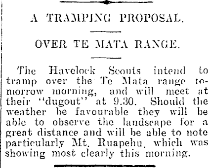 | A TRAY1PJXG PROPOSAL. j OVER TE MATA RAXGE. Tlie Havelock Scouts intend to tramp over tlie Te Mata range tomorroiv morning, and will meet at their "dugout" at 9.30. Should the weather be favourable tliey will be able to observe the landscape for a great distance aud will be able to note particularly Mt. Ruapehu. whicli was shoiving most clearly this morning.