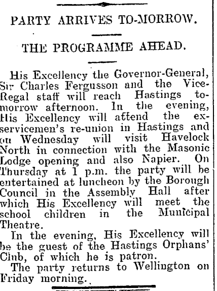 party arrives td-morroav. THE PROGRAMME AHEAD. His Excellency tlie Governor-General, Sir Charles Fergusson and the YiceRegal staff will reacli Hastings _ tomorrow afternoon. In tlie evenmg, His Excellency will afitend the exservicemen' s re-union in Hastings and ou Wednesday will visit Havelock North in connection witli the Masonic Lodge opening and also Napier. On Thursday at 1 p.m. the party will be entertained at luncheon by tlie Borough C'ouncil in the Assembly Hall after which His Excellency will meet^ the school children in the Munleipal Theatre. In the evening, His Excellency will he the guest of the Hastings Orphans' Club, of which he is patron. Tlie party returns to AVellington on Friday morning.,