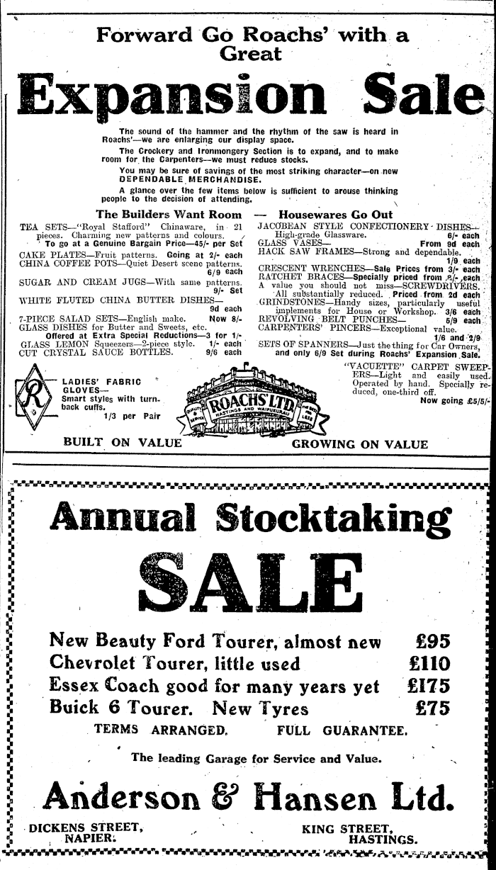 Forward Go Roachs' with a Great . •/• .* ; • * l\. 1 Expanslon Sale The sound of the hammer and the rhythm of the saw is heard in Roachs' — we are enlarging our display space. The Crockery and Ironmongery Section is to expand, and to make room for the Carpenters — we must reduce stocks. ' " ^ You may be sure of savings of the most striking character — on new DEPENDABLE MERCHANDISE. A glance over the few items beiow is sufficient to arouse thinking - V people to the decision of attending. • The Builders Want Room — Housewares Go Out TEA SETS — "Royal Stafford" Chinaware, in 21 JACGBEAN STYLE CONFECTIONERY - DISHES— pieces. Gharniing new patterns and colours. / High-grade Glassware. 6/- each ' • ' To go at a Genuinc Bargain Price — 45/- per Set GLASS VASES — * . From 9d each ^ CAKE PLATES— Fruit patterns. Going at 2/- each HACK SAW FRAMES Strong and dependable. / J CHrnA COFFEE POTS— Qmet Desert scene pattenrs. CRESCENT WRENCHES— Sale Pricos from 3/- each SUGAR AND OllEAM JUGS-Witl, same patterns VHITE FLUTED CHINA BUTTEIt DISHES- * GRINDSTONES— EUiK/^stzes, 'gScSZ, "JS&$ 9d each i^nplements for House or Workskop. 3/6 each ■ 7-PIECE SALAD SETS— English make. Now 8/- REVOLVING BELT PUNCHES— 5/9 each^ GLASS DISHES for Butter and Sweets, etc. CARPENTERS' PINCERS— Exceptional value Offered at Extra Special Reductions — 3 for 1/- • y8 and '2/9- i' GLASS LEMON Squeezers— 2-piece style. 1/- each SETS OF SPANNERS — Just the thing for Car Owners CUT CRYSTAL SAUCE BOTTLES. 9/6 each and only 6/9 Set during Roachs' Expansion.Salei :~ A. ■ "VACUETTE" CARPET SWEEPLADIES' FABRIC Operated by hand. Specially reffwJ \ GkOVES — duced, one-third off. SJ\J ?m?rt siy,es w,th turn- LTnW*L Now s°ine jes/s/- " l-^/- CUf,S'l/3 per Pair / / BUILT ON VALUE GROWING ON VALUE I I ''-'j I Annual Stocktaking j SALE 5 I New Beauty Ford Tourer, almost new £&5 1 { Chevrolet Tourer, little used £110 1 / Essex Coach good for many years yet £175 1 S Buick 6 Tourer. New Tyres £75 1 S TERMS ARRANGED. FULL GUARANTEE. 1 5 , The leading Garage for Service and Value. ' 31 \ Anderson & Hansen Ltd. 1 J DICKENS STREET, ^ , KING STREET, m J . NAPIER; HASTINGS. 9 v^www^vvwyw«vv» W»WWAW.VWW,«WA