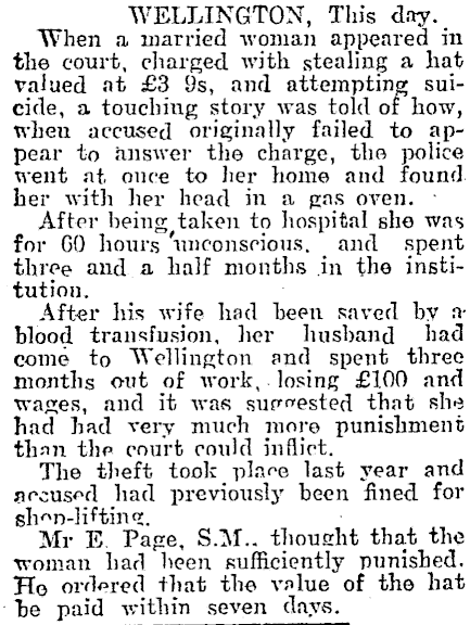 WELLINGTON, This day. When a married woman appeared in the court, charged with stealing a hat valued at £3 9s, and attempting suicide, a touching story was told of how, wheu accused originally failed to appear to answer the charge, the police went at ouce to her home and found her with her head in a gas oven. After being taken to hospital slie was for G0 hours unconsoious. and spent three and a lialf months in the institution. After his wife had been saved by nhlood transfnsion, her husband bad come to Wellington and spent tbrec months out of work, losing £100 and wages, and it was supeested that she had had verv muoh more punishment tlmn the eourt could inflict. The theft took plaee last year and aecused had previously been fined for sh^n-lifting. Mr E. Page, S.M.. thouelit that the •woman had heen sufficiently punished. Ho ordered that the value of the hat be paid within seven days.