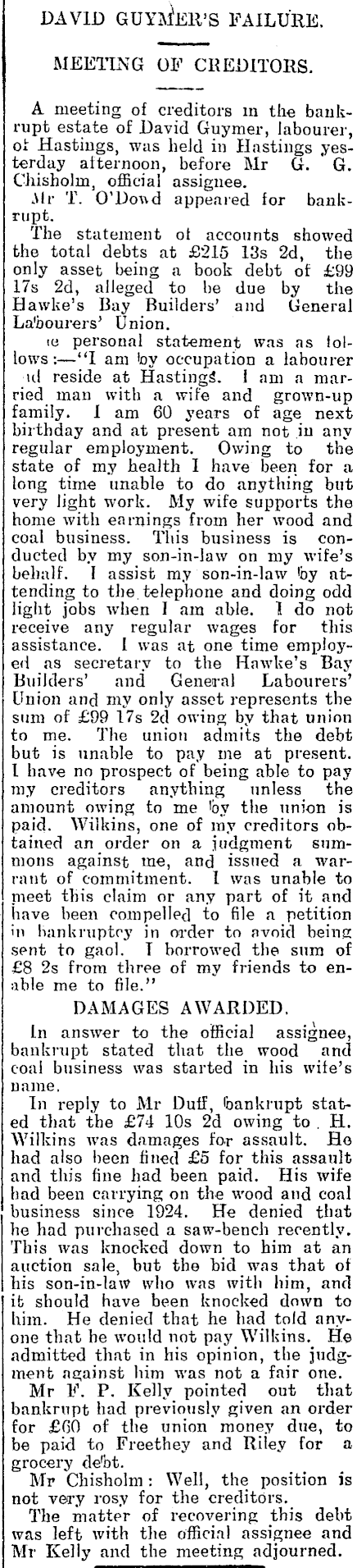 DAV1D GUYAfElt'S FAILURE. MEETING OF CREDITORS. A meeting of creditors m the bankrupt estate of David Guymer, labourer, of Hastings, was held in Hastings yesterday afternoon, before Mr G. ' G. Chisholm, ofiicial assignee. Mr T. O'Dovd appeared for bankrupt. The statement oi accounts showed the total debts at £215 13s 2d, tbe only asset being a book debt of £99 I7s 2d, alleged to be due by the Hawke's Bay Builders' and General La'bourers' Union. ie personal statement was as iollows : — "I am toy occupation a labourer ul reside at Hastings. 1 am a married man with a wife and grown-up family. I am 60 years of age next birthday and at present am not in any regular employment. Owing to the state of my health I have been for a long time unable to do anything but very light work. My wife supports the home with earnings from her wood and coal business. This business is conducted by my son-in-law on my wife's behalf. I assist my son-in-law foy attending to the telephone and doing odd light jobs when I am able. 1 do not receive any regular wages for this assistance. 1 was at one time employed as secretary to the Hawke's Bay Builders' and General Labourers' Union and my only assct represents tbe sum of £99 17s 2d owing by that union to me. The union adniits the debt but is unable to pay me at present. I have no prospect of being able to pay my creditors anything unless the amount owing to me 'oy the union is paid. Wilkins, one of my creditors obtained an order on a judgment summons against me, and issued a warrant of commitment. I was unable to nieet this claim or any part of it and have been compelled to file a petition in hankruptcy in order to avoid being sent to gaol. T borrowed the sum of £8 2s from three of my friends to enable me to file." DAMAGES AWARDED. In answer to the offieial assignee, bankrupt stated that the wood and coal business was started in his wife's name, In reply to Mr Duff, foankrupt stated that the £74 10s 2d owing to . H. Wilkins was damages for assault. Ho had also been fined £5 for this assanlt and this fine had been paid. His wife had been carrying on the wood and coal business since 1924. He denied that he had purchased a saw-bench recentlv. This was knocked down to him at an auction sale, but the bid was that of his son-in-law who was with him, and it should have been knocked down to him. He denied that he had told anvone that he would not pay Wilkins. He admitted that in his opinion, the judgment against him was not a fair one. Mr F. P. Kellv pointed out that bankrupt had previousiy given an order for £60 of the union money due, to be paid to Freethey and Riley for a grocery de'bt. Mr Chisholm : Well, the position is not very rosy for the creditors. The matter of recovering this debt was left with tlie offieial assignee and Mr Kelly and the meeting adjourned.