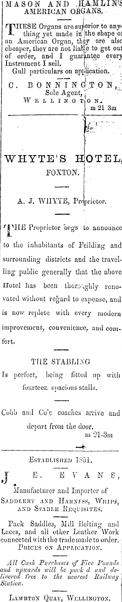 MASON AND EAMLIFS AMERICAN ORGANS. npHESE Organs are superior to any■L thing yet made in Ithe shape of an American Organ, they are also cheaper, they are not liable to get out of order, and I guarantee every Instrument I sell. I f . , Gull particulars on application. C . BONNIN Ct T 0 N, Sole Agent, j Welling ti'o n, m 21 3m WHYTE’S HIOTEL, 1 FOXTON. I A. J. WHYTE, Proprietor. r | ''HE Proprietor begs to announce A to the inhabitants of Feilding and surrounding districts and the travelling public generally that the above Hotel lias been thoroughly renovated without regard to expense, and is now replete with every modern improvement, convenience, and comfort. THE STABLING Is perfect, being fitted up with fourteen spacious stalls. Cobb and Co’s coaches arrive and depart from the door. m 21-3 m Established 1351. I E , E V A N S , pj a Manufacturer and Importer of Saddlery and Harness, Whips, and Stable Requisites. Pack Saddles, Mill Belting and Laces, and all other Leather Work connected with the trade made to order. Prices on Application. All Cash Purchases of Fire Pounds and upwards will he -pack d and de- j livered free to the nearest Hallway Station. Lambton Quay, Wellington.