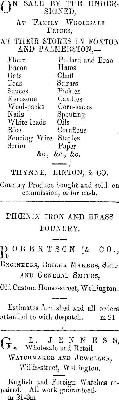 N SALE BY THE UNDERSIGNED, At Family Wholesale Prices, AT THEIR STORES IN FOXTON AND PALMERSTON,--Flour Bacon Oats Teas Sauces Kerosene Wool-packs Nails White leads Rice Fencing’ Wire Scrim &c., Pollard and Brai TI ams ChadSugars Pickles Candles Corn-sacks SpoutingOils Cornflour Staples Paper Ac., Ac. THYNNE, LINTON, & CO. Country Produce bought and sold on commission, or for cash. PIICENIX IRON AND BRASS FOUNDRY. ROBERTSON CO., Engineers, Boiler Makers, Ship and General Smiths, Old Custom House-street, Wellington. Estimates furnished and all orders attended to with despatch. m 21 Wa L. J E N N E S S, Wholesale and Retail TCHMAKER AND JEWELLER, Willis-street, Wellington. English and Foreign Watches repaired. All work guaranteed, m 21-dm