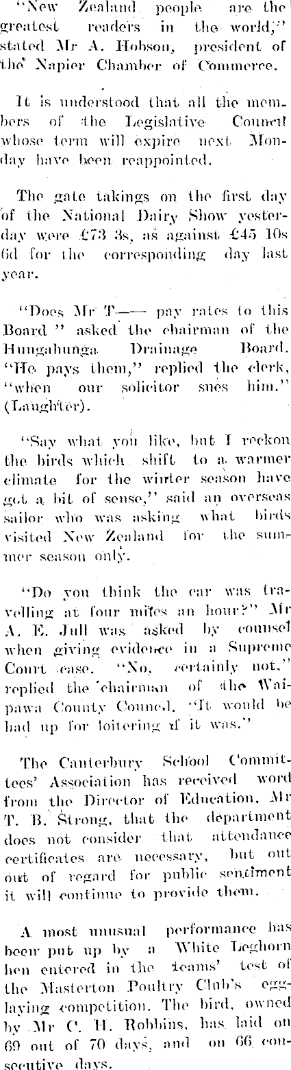 “Now Zealand people. are the greatest readers in the world,"’ stilted Mr A. ITobson, president of 'live Napier Chamber of Cnmmerre. it is understood that all the members of •the Legislative Conned whose term will expire next Monday have been reappointed. The gate takings on the first day of the National Daily Show yesterday were {.‘73 3s, as against £45 Ids (id for the corresponding day last year, “Does Mr T— — pay rates to this Board ” asked the chairman of the Hnngahunga Drainage Board. “He pays them,” replied the clerk, “when our solicitor sues him.” (Laugh*! or). “Say what you like, hut I reckon the birds which shift to a. warmer climate for the winter season have got a. bit of sense,” said an overseas sailor who was asking what hints visited New Zealand for the summer season only. “Do yon think the ear was travelling at four mites an hour!-'” Air A. E. dull was asked by counsel when giving evidence in a Supreme Court case. “No. certainly not, replied the "chairman of the 1\ aipavva County Conned. “It would be had up for loitering d it was. The Canterbury School Committees’ Association has received word from the Director of Education. Mr T. B. Strong, that the department does not consider that attendance certificates are necessary, hut out out of regard for public sentiment it will continue to provide them. A most unusual performance has beeiv put up bv a M bite Leghorn hen entered in the learns’ test o! the Mastcrton Poultry Club’s egglaying competition. The bird, owned by .Mr C. H. Bobbins, has laid on Of) out of 70 days, and on 00. consecutive days.