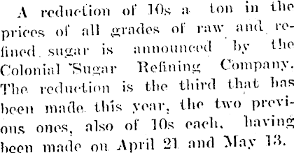 A reduction of 10s a ton in the prices of all grades of raw and relined. sugar is announced by the Colonial 'Sugar "Refining Company. The reduction is the third that has been made lids year, the two pie\ious ones, also of 10s each, having been made on April 21 and May IT