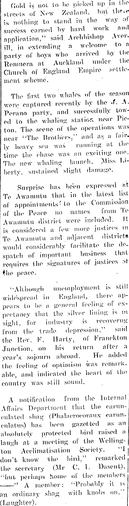 ("jobl is not to lie picked up in the streets of New Zealand. but thc.e is nothing to stand in the way ;>! success earned by hard work and application,” said Archbishop Averill, in extending a welcome to a party ot boys who mined ht tin. Rcmncra. at Auckland under the Church of England Empire settlement scheme. The first two whales of the season were captured recently by the -L A. Perano party, and successfully towed to the whaling station near Pieton. The scene of the operations was near “The Brothers." and as a fair. Iv heavv sea was running at the time the elmse was an exciting one. The new whaling launch. Miss Liberty, sustained slight damage. Surprise has been expressed Te Awamutu that in the latest list of appointments- to the Commission of tlie Peace no names from To Awamutu district were included. It is considered a few more justices m To Awamutu and adjacent districts would considerably facilitate the despatch of important business that requires the signatures of justices nf *he peace. “Although unemployment is still widespread in England, there appears to be a general feeling of expectancy that the silver lining is m sight, for industry is vecoverng from the trade depression,” said the Rev. K. Unity, of Eranckton Junction, on his return after a year’s sojourn abroad. He added the feeling of optimism was remarkable, and indicated the heart of the country was still sound. A notification from the Internal Affairs Department that the earuneulated shag (Bhalacrocoraux earuncnlatns) has been gazetted as an absolutely protected bird raised a laugh at a meeting of the "Wellington Acclimatisation Society. “1 don’t know the bird,” remarked the secretary (Mr C. I. Dasent), “hut perhaps home of the members ■ ” A member: “Probably it is an ordinary shag with knobs on. (Laughter).