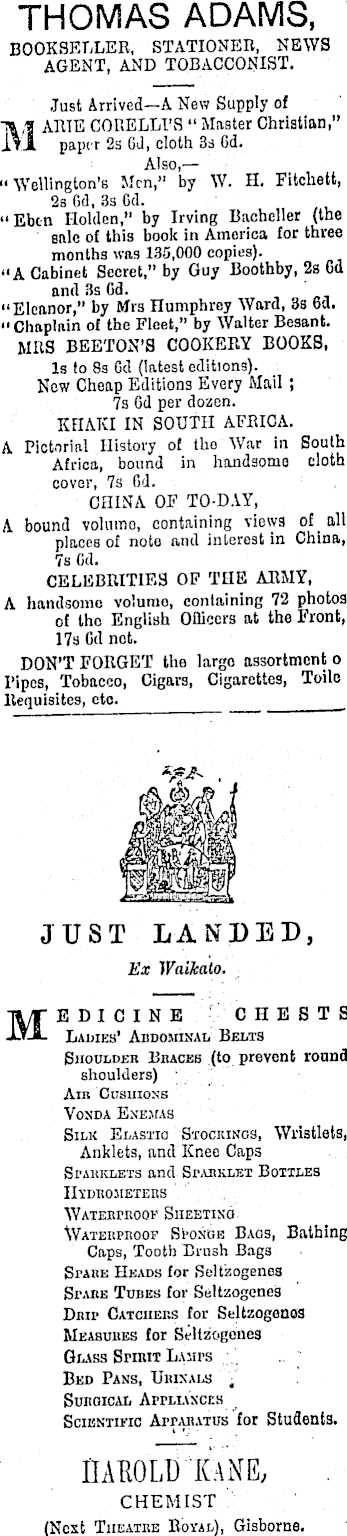 THOMAS ADAMS, BOOKSELLER, STATIONER, NEWS AGENT, AND TOBACCONIST. Just Arrived—A New Supply of MARIE CORELLI'S “ Master Christian,” paper 2s GJ, cloth 3s Gd. Also,— «Wellington’s Men,” by W. H. Fitcliett, 2s Gd, 3s Gd. “ Ebcn I-lolden," by Irving Bacheller (the sale of this book in America for three months was 135,000 copies). •■A Cabinet Secret," by Guy Boothby, 2s Gd and 3s Gd. “Eleanor,” by Mrs Humphrey Ward, 3s 6d. "Chaplain of the Fleet,” by Walter Besant. MRS BEETON’S COOKERY BOOKS, Is to 8s Gd (latest editions). New Cheap Editions Every Mail ; 7s Gd per dozen. KHAKI IN SOUTH AFRICA. A Pictorial History of the War in South Africa, bound in handsome cloth cover, 7s Gd. CHINA OF TO-DAY, A bound volume, containing views of all places of note and interest in China, 7s Gd. CELEBRITIES OF THE ARMY, A handsome volume, containing 72 photos of the English Officers at the Front, 17s Gd not. DON'T FORGET the large assortment o Pipes, Tobacco, Cigars, Cigarettes, Toile Requisites, etc. JUST LANDED, Ex Waikato. Medicine chests Ladies’ Abdominal Belts Shoulder Braces (to prevent round shoulders) Air Cushions Vonda Enemas Silk Elastic Stockings, Wristlets, Anklets, and Knee Caps Sparklets and Sparklet Bottles Hydrometers Waterproof Sheeting Waterproof Sponge Bags, Bathing Caps, Tooth Brush Bags Spare Heads for Seltzogenes Spare Tubes for Seltzogenes Drip Catchers for Seltzogenes Measures for Seltzogenes Glass SnniT Lamps Bed Pans, Urinals „ Surgical Appliances Scientific Apparatus for Students. HAROLD KANE, CHEMIST (Next Theatre Royal), Gisborne.