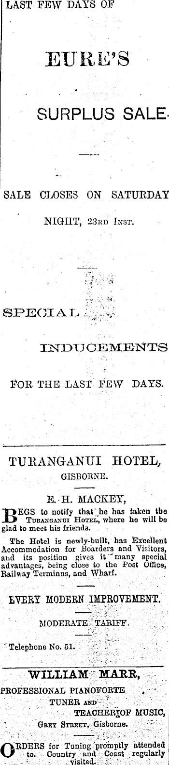 LAST FEW DAYS OF EUIIE’S SURPLUS SALESALE CLOSES ON SATURDAY NIGHT, ‘23kd Inst. SXYEOIAL v. -v lISTDIJ CEMENTS FOR THE LAST FEW DAYS. TU HANGANTJI HOTEL, GISBORNE. E. H. MACKEY, BEGS to notify that'he has taken the Tueaxgaxci Hotel, ■where he will be glad to meet his friends. The Hotel is newly-built, has Excellent Accommodation for Boarders and Visitors, and its position gives it " many special advantages, being close to the Post Office, Railway Terminus, and Wharf. EVERY MODEM IMPROVEMENT. MODERATE TARIFF. Telephone No. 51. WILLIAM MARE, PROFESSIONAL PIANOFORTE TUNER AM) MUSIC, Grey Street, Gisborne. ORDERS for Tuning promptly attended to. Country and Coast regularly visited.