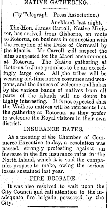 NATIVE GATHERING. (By Telegraph—Press Association.) Auckland, last night. The Hon. James Carroll, Native Minister, has arrived from Gisborne, on route to Rotorua, on business in connection with the reception of the Duke of Cornwall by t’qe Haoris. Mr Can-oil v/ill inspect the sites suggested for the Maori encampment at Rotorua. The Native gathering at Rotorua in June promises to be an exceedingly large one. All jffie tribes will be wearing old-time native costumes and weapons, and the dances of welcome and hakas by the various bands of natives from all parts of the islands will no doubt be highly interesting. It is not expected that the Waikato natives will be represented at the gathering at Rotorua, as they prefer to welcome the Royal visitors in their own district. INSURANCE RATES. At a meeting of the Chamber of Commerce Executive to-day, a resolution was passed, strongly protesting against an increase in the fire insurance rates in the North Island, which it is said the companies propose to make, owing the serious losses sustained last year. FIRE BRIGADE. . It was also resolved to wait upon the City Council'and call attention to the inadequate fire brigade possessed by the City. ___