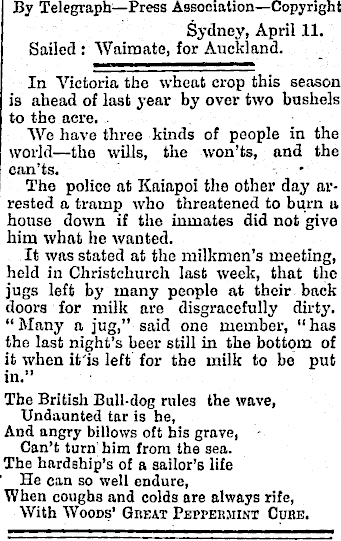By Telegraph—Press Association—Copyright Sydney, April 11. Sailed : Waimate, for Auckland. In Victoria the wheat crop this season is ahead of last year by over two bushels to the acre. We have three kinds of people in the world—the wills, the won’ts, and the ean’ts. The police at Kaiapoi the other day arrested a tramp who threatened to burn u house down if the inmates did not give him what he wanted. It was stated at the milkmen’s meeting, held in Christchurch last week, that the jugs left by many people at their back doors for milk are disgracefully dirty. “Many a jug,” said one member, “has the last night’s beer still in the bottom of it when it'is left for the milk to be put in.” The British Bull dog rules the wave, Undaunted tar is he, And angry billows oft his grave, Can’t turn him from the sea. The hardship’s of a sailor’s life ' He can so well endure, When coughs and colds are always rife, With Woods’ Great Peppermint Cure.