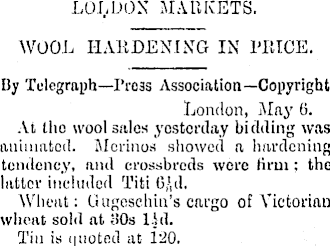 LOLDON MARKETS. WOOL HARDENING IN PRICE. By Telegraph—Press Association—Copyright London, May 6. At the wool sales yesterday bidding was animated. Merinos showed n hardening tendency, and crossbreds wore linn : the latter included T’iti 0, } ,d. Wheat: Gugeschiu’s cargo of Victorian wheat sold at 80s lid. Tin is quoted at 120.