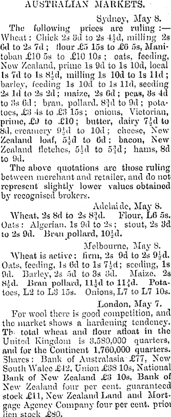 AUSTRALIAN MARKETS. Sydney, May 8. The following prices arc ruling : Wheat: Chick 2s lid to 2s lid, milling 2s Gd to 2s 7d ; Hour L 5 Ids to JIG ss, Manitoban LlO 5s to .£lO 10s ; oats, feeding, New Zealand, prime Is 9d to Is lOd, local Is 7il to Is Sld, milling Is lOd to Is lid ; barley, feeding Is lOd to Is lid, seeding 2s Id to 2s 2d ; maize, 2s Gd ; peas, 0s Id to 3s Gd ; bran, pollard, Bijd to 9d ; potatoes, LG Is to LG 15s; onions, Victorian, prime, LJ to .CIO ; butter, dairy 71 dto Bd, creamery 9.1 dto lOd ; cheese, New Zealand loaf, old to Gd; bacon, New Zealand tlotches, 5.1 d to s:jd; hams, 8d to 9d. The above quotations are those ruling between merchant and retailer, and do not represent slightly lower values obtained by recognised brokers. Adelaide, May 8. Wheat, 2s Sd to 2s B'Jd. Flour, LG os. Oats : Algerian, Is 9d to 2s; stout, 2s Gd to 2s 9d. Bran pollard, lO.ld. Melbourne, May 8. Wheat is active: firm, 2s 9d to 2s 9.U1. Oats, feeding, Is Gd to Is 7.1(t; seeding, Is 9d. Barley, 2s od to 3s Gd. Maize. 2s Hid. Bran pollard, Hid to 11:,’d. Potatoes, L2 to LG 15s. Onions, L7to L 7 10s. London, May 7. For wool there is good competition, and the market shows a hardening tendency. Th total wheat and dour adoat in the United Kingdom is G,580,000 quarters, and for the Continent 1,760,000 quarters. Shares: Bank of Australasia L 77, New South W’alee £4.2, Union L3B 10s, National Bank of New Zealand LG 10s, Bank of New Zealand four per cent, guaranteed stock Lll, New Zealand Land and Mortgage Agency Company four per cent, prior lien stock LBO.