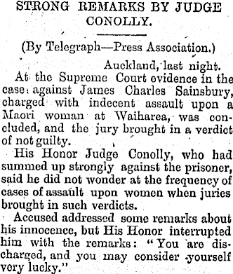 STRONG REMARKS BY JUDGE CONOLLY. (By Telegraph—Press Association.) Auckland, last night. At the Supreme Court evidence in the case: against James Charles Sainsbury, charged with indecent assault upon a Maori woman at Waiharea, was concluded, and the jury brought in a verdict of not guilty. His Honor Judge Conolly, who had summed up strongly against the prisoner, said he did not wonder at the frequency of cases of assault upon women when juries brought in such verdicts. _ Accused addressed some remarks about his innocence, but His Honor interrupted him with the remarks: “ You are discharged, and you may consider -yourself very lucky.”