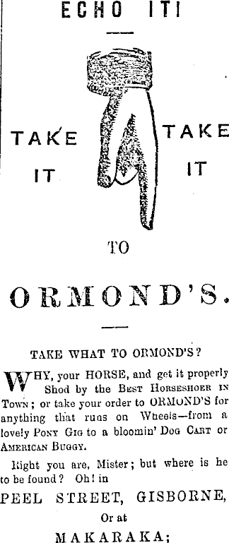 ECHO iTI WmM TAKE IT TAKE IT O R M OND’S TAKE WHAT TO ORMOND’S? WHY, your HORSE, and got it properly Shod by the Bust Horseshoer in Town ; or take your order to ORMuND'S for anything that ruas on Wheels—from ft lovely Font Gig to a bloomin’ Dog Cart or American Buggy. Right you are, Mister; but where is he to be found? Ohl in PEEL STREET, GISBORNE, Or at MAKAR AKA;