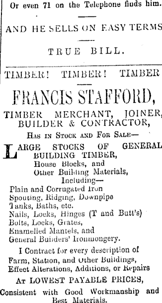 Or even 71 on the Telephone finds him. AND H E SELLS ON EASY TERMS. TRUE BILL. TIMBER! TIMBER! TIMBER! FRANCIS STAFFORD, TIMBER MERCHANT, JOINER, BUILDER & CONTRACTOR, Has in Stock and Fob Sale — Large stocks of general BUILDING TIMBER, House Blocks, and Other Building Materials, Including— Plain and Corrugated iron Spouting, Ridging, Downpipa 1 auks, Baths, etc. Nails, Locks, Hinges (T and Butt’s) Bults, Locks, Grates, Enamelled Mantels, and General Builders’ Ironmongery. I Contract for every description of Farm, Station, and other Buildings, Effect Alterations, Additions, or Repairs At lowest payable prices, Consistent with Good Workmanship and Best Materials.