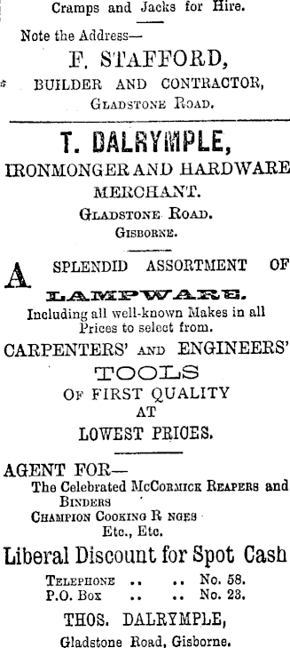 Cramps and Jacks for Hire. Note the Address — F. STAFFORD, * BUILDER AND CONTRACTOR, Gladstone Road. T. DALRYIVIPLE7 IRONMONGER AND HARDWARE MERCHANT. Gladstone Road. Gisborne. SPLENDID ASSORTMENT OF Including all well-known Makes in all Prices to select from. CARPENTERS’ and ENGINEERS’ TOOLS Ok first quality AT LOWEST PEIOES. AGENT FOE— The Celebrated McCormick Reapers and Binders Champion Cooking R nges Etc., Etc. Liberal Discount for Spot Cash Telephone .. .. No. 58. P.0.80x .. .. No. 23. THOS. DALRYMPLE, Gladstone Road, Gisborne.