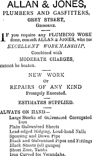 ALLAN & JONES, PLUMBERS AND GASFITTERS, GREY STREET, Gisborne. iP you require any PLUMBING WORK done, consult ALLAN A .TONES, who lor EXCELLENT WORKMANSHIP, Combined with MODERATE CHARGES, cannot be beaten. NEW WORK Or REPAIRS OF ANY KIND Promptly Executed. ESTIMATES SUPPLIED. ALWAYS ON HAND— Large Stocks of Galvanised Corrugated Iron Plain Galvanised Sheets Lead-edged Ridging, Lead-head Nails Spouting and Down Pipe Black and Galvanised Pipes and Fittings Black Sheets (all gauges) Sheet Zinc, Tanks Iron Curved for Verandahs.