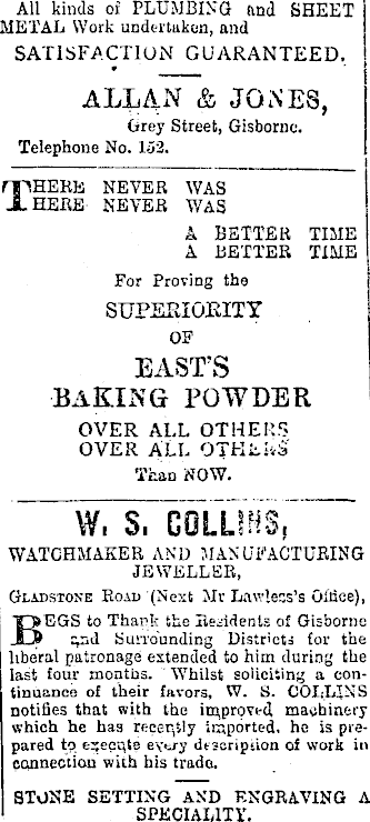 All kinds or PLUMBING and SHEET METAL Work undertaken, and SATISFACTION GUARANTEED, ALLAN & JONES, Grey Street, Gisborne. Telephone No. 152. TBAHERE NEVER WAS A HERE NEVER WAS A BETTER TIME A BETTER TIME For Proving the SUPESIOBITY OF EAST’S baking powder OVER ALL OTHERS OVER ALL OTHERS Than NOW. W, S, COLUHS, WATCHMAKER AND MANUFACTURING JEWELLER, Gladstone Road (Nest Mr Lawless’s Office), BEGS to Thank the Residents of Gisborne and Surrounding Districts for the liberal patronage extended to him during the last four mouths. Whilst soliciting a continuance of their favors, W. S. COLLINS notifies that with the improved machinery which he has recently imported, he is prepared to execute every description of work in connection with his trade. STONE SETTING AND ENGRAVING A SPECIALITY.