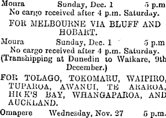 Monra Sunday, Dec. 1 p.m No cargo received after 4 p.m. Saturday. FOlt MELBOURNE VIA BLUFF AND HOBART. Moura Sunday, Dec. 1 5 p.m No cargo received after 4 p.m. Saturday. (Transhipping at Dunedin to Waikare, 9th December.) FOR TOLAGO, TOKOMARU, WAIPIItO, TUPAROA, AWANUI, TE ARAROA, HUE'S BAY, WHANGAPAROA, AND AUCKLAND. Omapere Wednesday, Nov. 27 5 p.m.