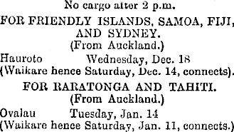 No alter 2 p.m. FOB FKIENDLY ISLANDS. SAMOA, FIJI, AND SYDNEY. (From Auckland.) Hauroto Wednesday, Dec. IS (Waikare hence Saturday, Dec. 14, connects). FOB BABATONGA AND TAHITI. (From Auckland.) Ovalau Tuesday, Jan. 14 (Waikare hence Saturday, Jan. 11, connects.)
